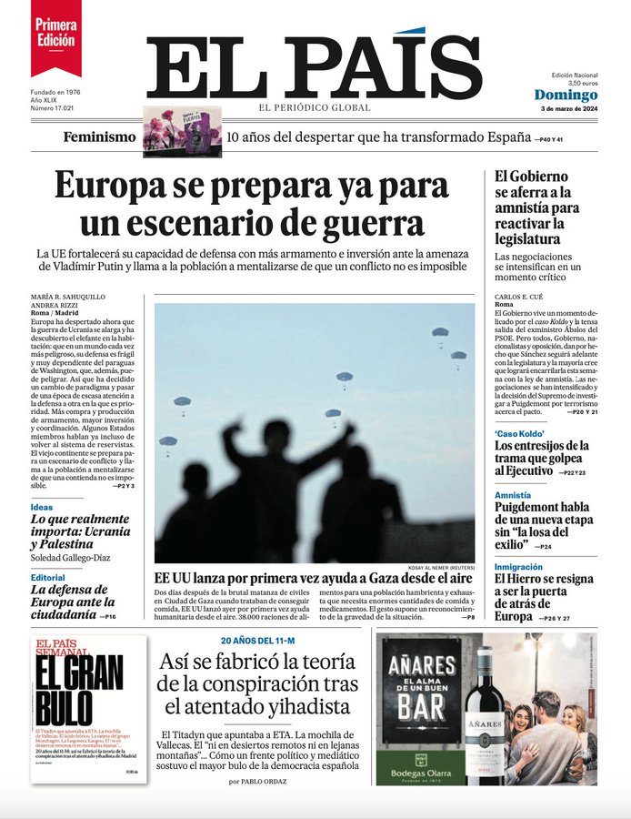 - Bruselas insta a la UE a reforzar los ejércitos: «El riesgo de guerra no es inminente, pero no es imposible» (eldiario.es).